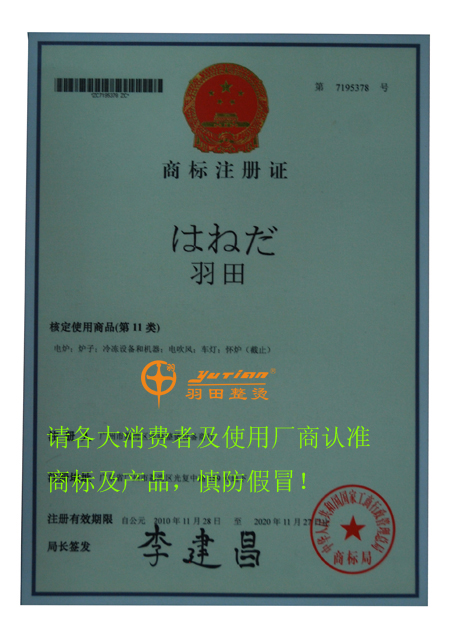 以下為我司的商標注冊證書,請各大消費者、使用廠商及經銷代理商認準我“羽田”牌制衣整燙設備的商標及產品: