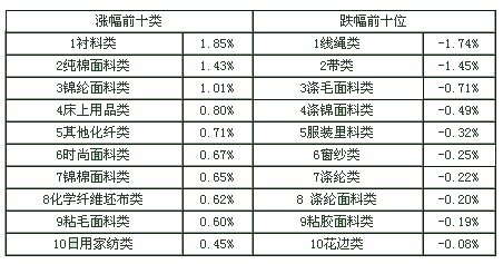 本期價格指數與年初比上調1.89%,去年同比上調1.87%。本期從一級分類品種中顯示:原料類、坯布類、服裝面料類、家紡類價格指數不等量上調,拉動總類價格指數小幅回升。但服飾輔料類價格指數小幅下跌,相對制約了總類價格指數的回升幅度。