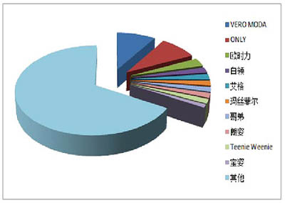前十位品牌市場綜合占有率相比去年同期提高1.8%,相比上月下降0.38%。VERO MODA和ONLY仍以絕對優勢占據榜單前兩位,與上月相比,VERO MODA市場綜合占有率提高2.45%,ONLY提高2.57%。排名三至十位的品牌市場綜合占有率比上月有所降低。