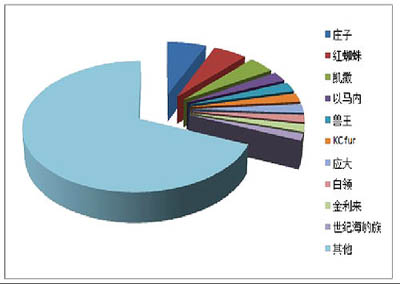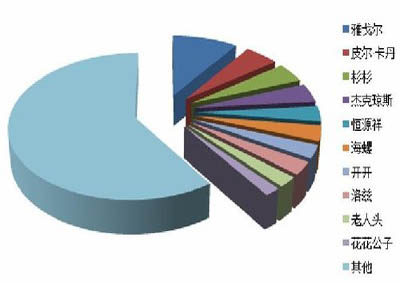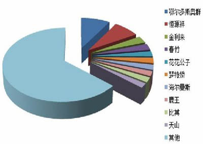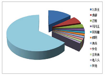 2012年1月份褲子市場前十位品牌市場占有率達到35.44%,比上月提高1.52%,但比去年同期低3.04%。與上月相比,前四位品牌無變化,九牧王仍以領先優勢位居第一,虎都、邁雅、利丹王位居第二到第四位。后六位品牌市場綜合占有率較低,低于2%,差距也十分小,競爭比較激烈。