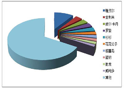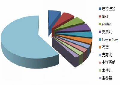 根據統計,2012年1月份全國童裝市場集中度為42.86%,相比上月提升了5.14%。從前十位品牌排名情況來看,巴拉巴拉、NIKE、adidas位居前三,安奈兒和Paw in Paw分別居第四和第五。前四名品牌和后四名品牌市場占有率差距不大,第一名和第四名市場綜合占有率相差0.96個百分點,第七名和第十名相差0.66個百分點,競爭較為激烈。