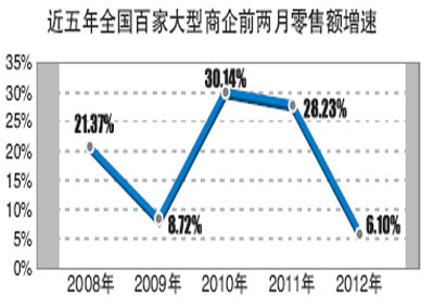 中華全國商業信息中心昨日發布的統計報告顯示,全國百家重點大型零售企業2月零售額同比呈現負增長,為-7.99%。其中,除去春節等不可比因素,今年1-2月全國百家重點大型零售企業服裝類商品零售額累計同比增長6.1%,較去年同期增速下降22.13個百分點,為近五年以來新低。
