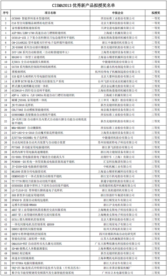 根據(jù)中國縫制機(jī)械協(xié)會《關(guān)于開展“CISMA2013優(yōu)秀新產(chǎn)品評選”的通知》(中縫協(xié)[2013] 06 號)要求,CISMA2013優(yōu)秀新產(chǎn)品項(xiàng)目申報(bào)及評選階段工作已基本完成,經(jīng)協(xié)會科技委組織專家對申報(bào)項(xiàng)目認(rèn)真評審,現(xiàn)將評選初步結(jié)果公布如下(詳見附件),請大家認(rèn)真核查,積極監(jiān)督,如有疑義,請于2013年9月6日之前反饋。