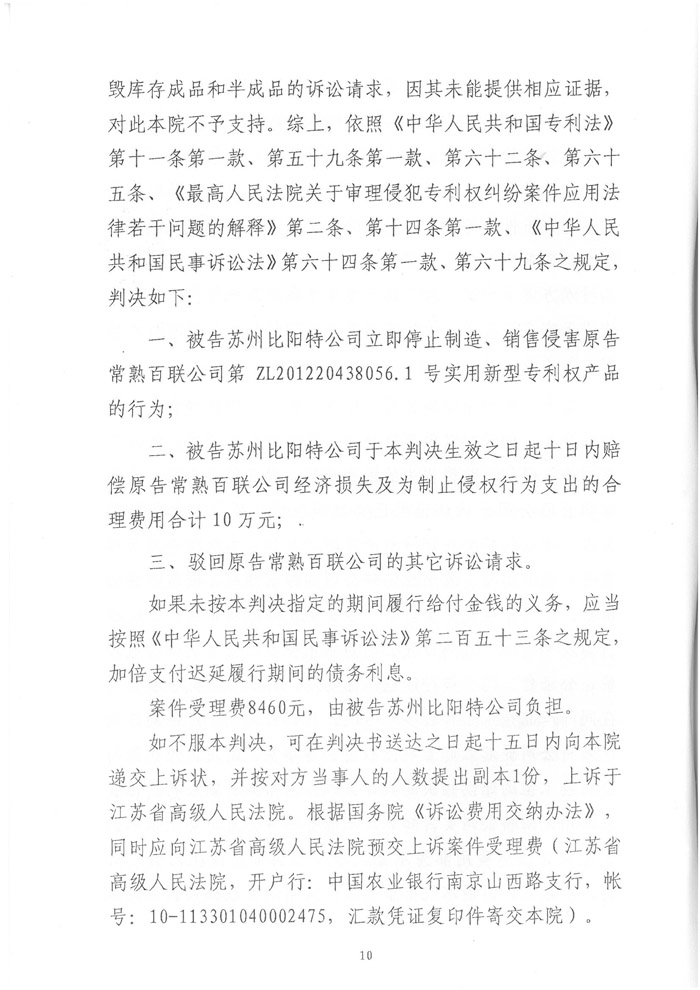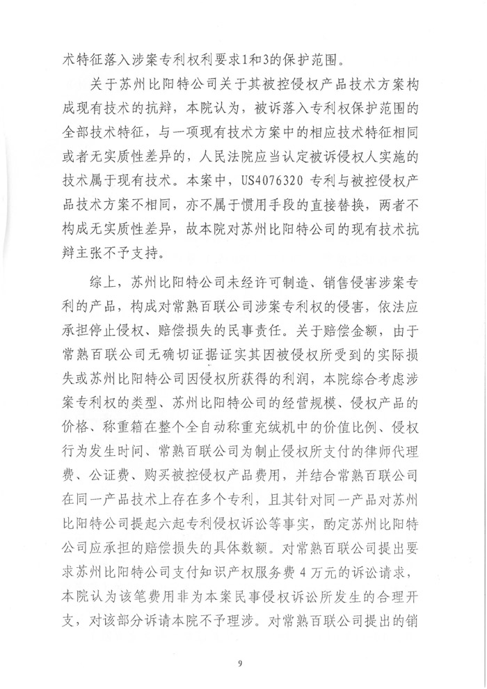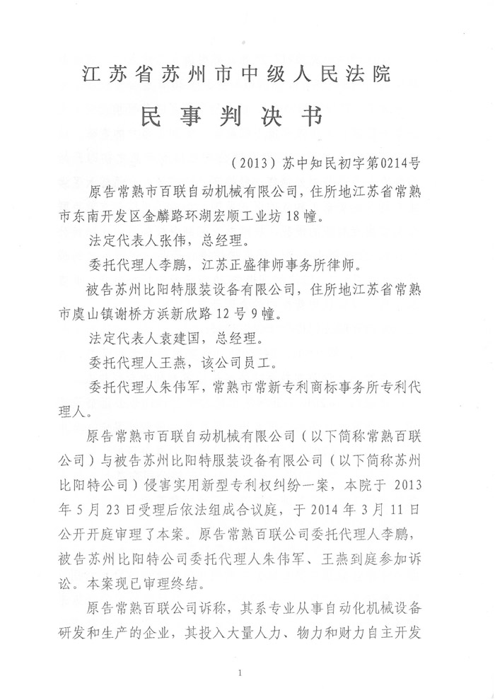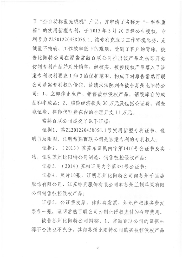 2014年3月19日,江蘇省蘇州市中級人民法院依法做出民事判決{(2013)蘇中知民初字第2014號},判決被告蘇州比陽特服裝設(shè)備有限公司立即停止制造、銷售侵害原告常熟百聯(lián)公司第ZL201220438056.1號(俗稱“全自動稱重充絨機(jī)”)實用新型專利權(quán)產(chǎn)品的行為,并賠償原告常熟百聯(lián)公司的經(jīng)濟(jì)損失及為制止侵權(quán)行為支出的合理費(fèi)用。