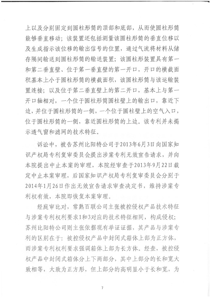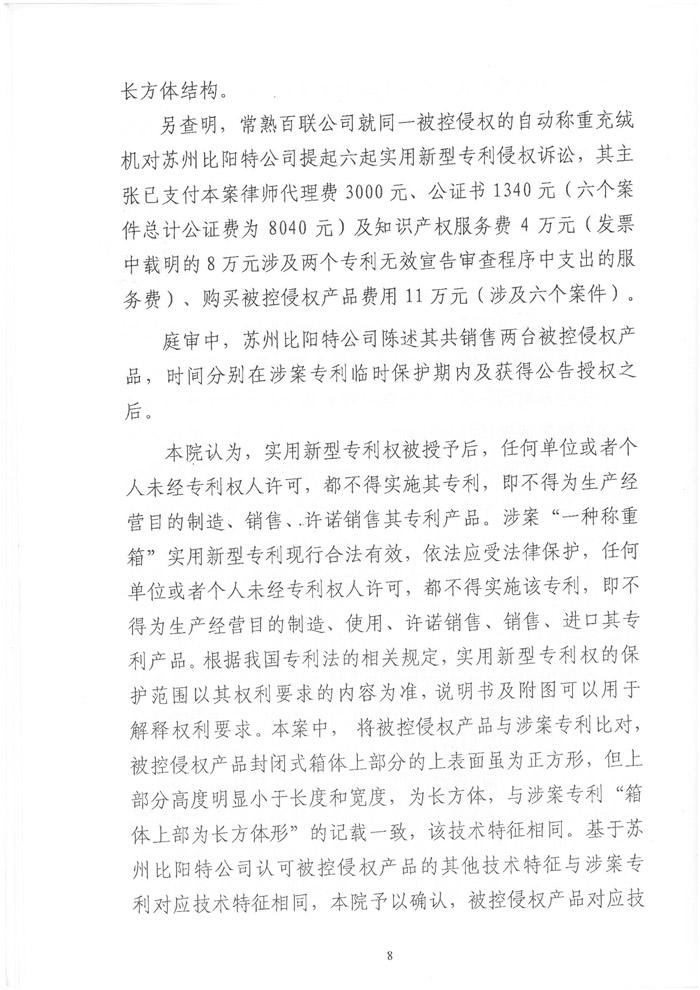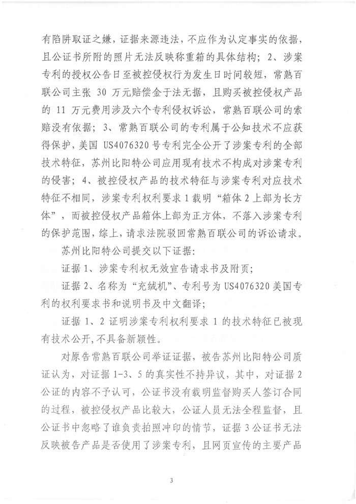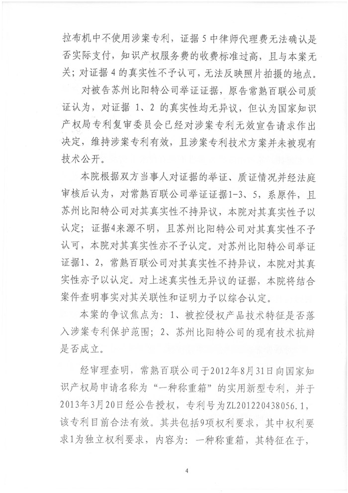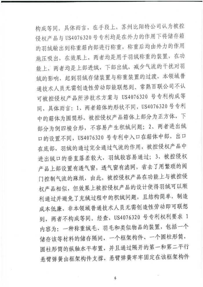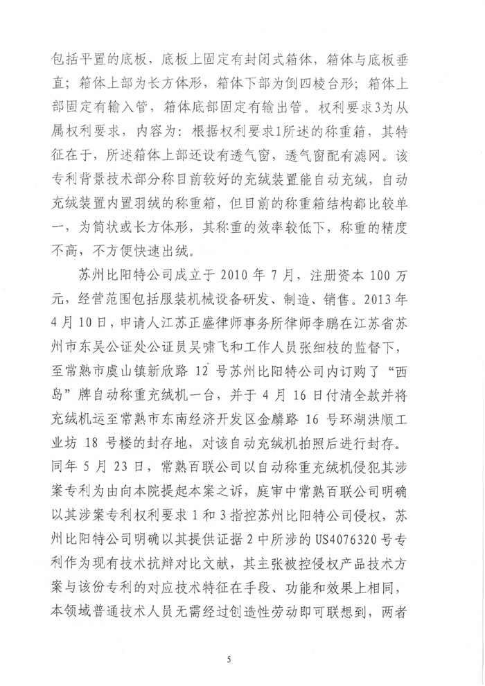 經(jīng)蘇州市中級人民法院審查后確認(rèn),涉案“一種稱重箱”(俗稱“全自動稱重充絨機(jī)”)實用新型專利現(xiàn)行合法有效,依法應(yīng)受法律保護(hù),任何單位或者個人未經(jīng)專利人許可,都不得實施其專利,即不得為和產(chǎn)經(jīng)營目的制造、使用、許諾銷售、銷售、進(jìn)口其專利產(chǎn)品。被控侵權(quán)產(chǎn)品對應(yīng)技術(shù)特征落入涉案專利要求1和3保護(hù)范圍。蘇州比陽特未經(jīng)許可制造、銷售侵害涉案專利的產(chǎn)品,構(gòu)成對常熟百聯(lián)公司涉案專利權(quán)的侵害,依法應(yīng)承擔(dān)停止侵權(quán)賠償損失的民事責(zé)任。2014年3月11日,蘇州中級人民法院進(jìn)行公開審理,3月19日,依照《中華人民共和國專利法》第十一條第一款、第五十九條第一款、第六十二條、第六十五條、《最高人民法院關(guān)于審理侵犯專利權(quán)糾紛案件應(yīng)用法律若干問題的解釋》第二條、第十四條第一款,《中華人民共和國民事訴訟法》第六十四條第一款、第六十九條之規(guī)定作出“比陽特”侵權(quán)成立的判決,下達(dá)了(2013)蘇中知民初字第2014號民事判決書。