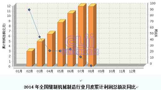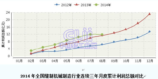 2014年1~8月,全國縫制機械制造行業累計完成利潤總額11.88億元,同比增長0.95%。其中:1月~2月份完成累計利潤總額2.96億元,同比增長93.97%;1月~3月份完成累計利潤總額4.92億元,同比增長49.12%;1月~4月份完成累計利潤總額6.44億元,同比增長25.74%;1月~5月份完成累計利潤總額8.72億元,同比增長25.33%;1月~6月份完成累計利潤總額10.55億元,同比增長28.51%;1月~7月份完成累計利潤總額11.93億元,同比增長15.69%。