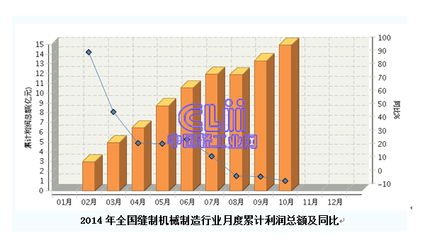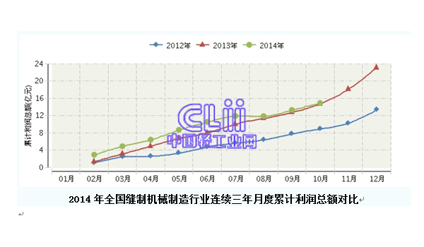 2014年1月~10月,全國縫制機械制造行業(yè)累計完成利潤總額14.94億元,同比增長-2.53%。前十個月份,利潤增速持續(xù)下滑,10月累計利潤總額14.94億元,同比增長-2.53%。