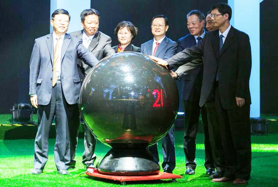 圖為眾領導在絲博會開幕式上共同啟動水晶球 從左至右依次為中國絲綢協會會長 楊永元、 中華人民共和國商務部市場運行司司長(國家繭絲辦主任) 陳國凱、中華人民共和國工業和信息化部消費品司副司長 曹學軍、杭州市人民政府副市長 謝雙成、中國紡織工業聯合會副會長 楊紀朝、中國紡織品進出口商會副會長 王宇、商務部駐杭州特派員辦事處副特派員 周關超