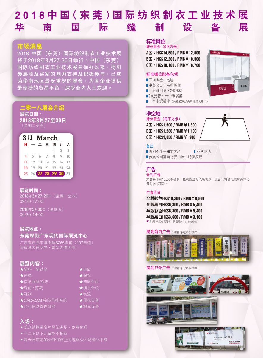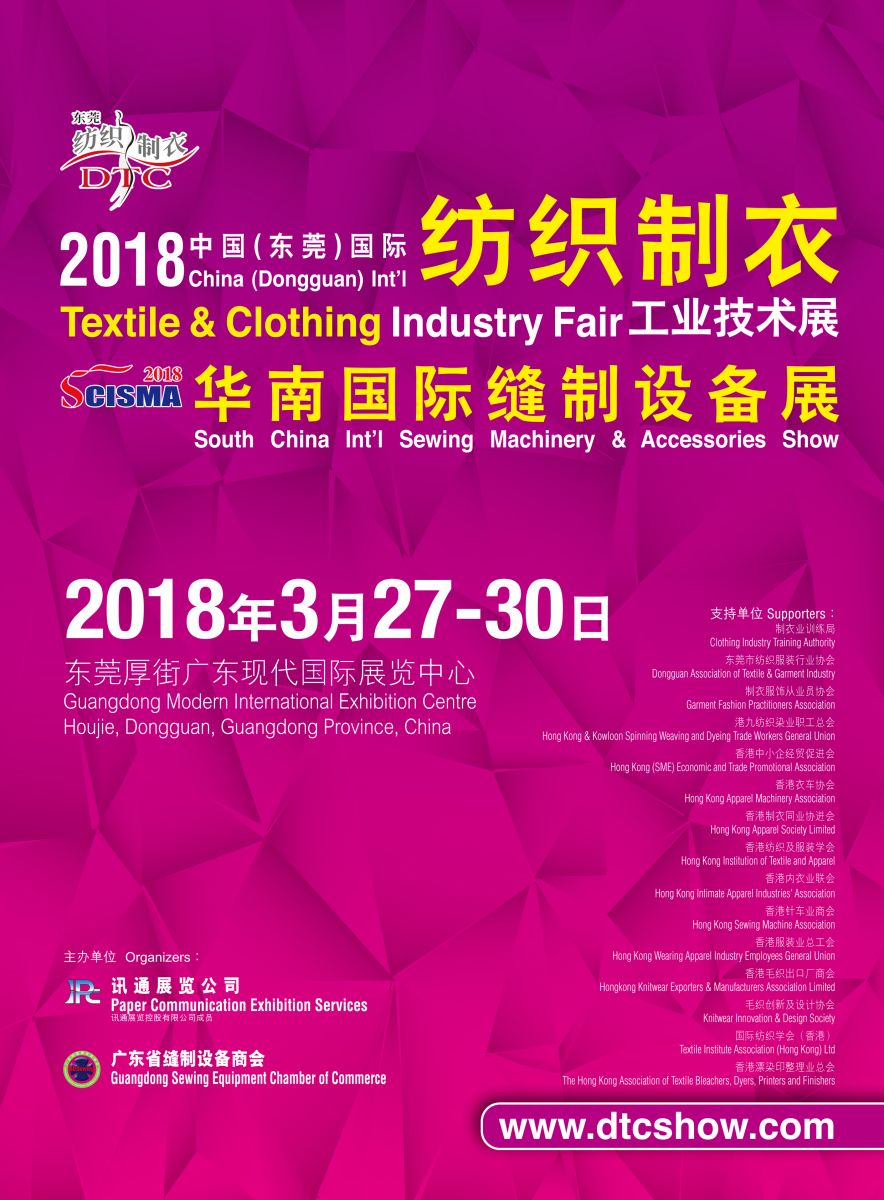 3月27-30日,由廣東省縫制設備商會、香港訊通展覽公司聯合舉辦的第十三屆華南國際縫制設備展暨第十九屆中國東莞國際紡織制衣工業技術展將在東莞厚街廣東現代展覽中心隆重舉行。