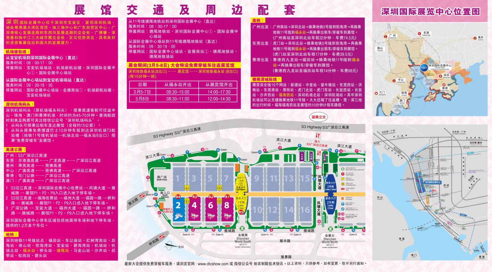 新展館距深圳機場T3航站樓7公里;緊鄰福永碼頭;沿江高速和廣深高速出入口直通展館;目前已開通的地鐵11號線福永站和橋頭站距展館僅5公里,近期規劃地鐵12號線、遠期規劃地鐵18、20號線將直接接駁展館;免費穿梭巴士將在展館和周邊的地鐵站、巴士場站、商業中心區、酒店等地往返。