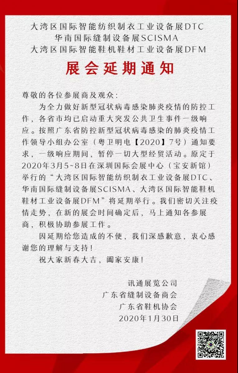 大灣區(qū)暨華南縫制設備展、鞋機鞋材展 展會延期通知