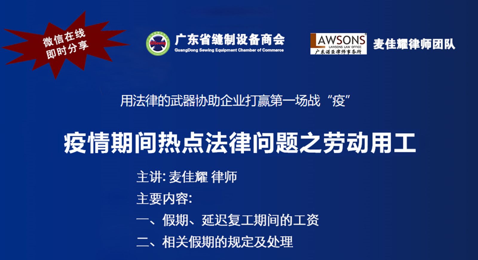 如何在法律的范圍內(nèi)結(jié)合實際靈活應對?成為企業(yè)當下最關心的問題。廣東省縫制設備商會與法律戰(zhàn)略合作伙伴廣東諾臣律師事務所麥佳耀律師團隊在2月17日開展️系列疫情期間熱點法律問題分享活動。此次活動在商會會員群進行,麥律師就企業(yè)復工條件、疫情假期工資支付等問題進行了詳細解答。法律講堂結(jié)束后,不少會員向律師咨詢了相關的問題。有需要的會員企業(yè)可以在商會會員群里找到相應的解答。