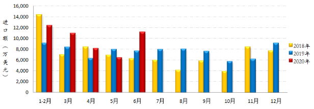 進口:據(jù)海關最新數(shù)據(jù)顯示,2020年1-6月我國縫制機械產(chǎn)品累計進口額4.87億美元,同比增長24.72%,增幅較前5月提升近5個百分點,顯示國內(nèi)市場正積極穩(wěn)步復蘇。其中工業(yè)縫紉機進口量1.9萬臺,進口額3396萬美元,同比分別下降18.99%和41.65%。