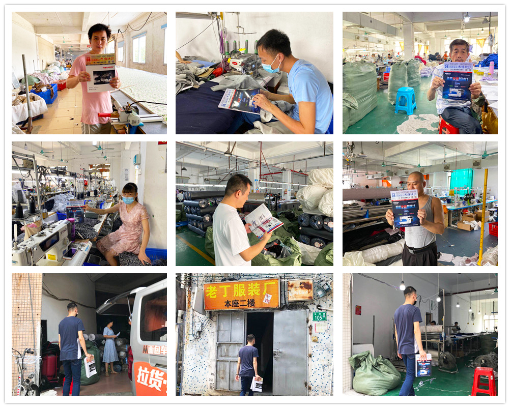記者向這里的各個(gè)廠家派發(fā)了行業(yè)期刊《紡織制衣市場快訊》,并與大家交流服裝行業(yè)復(fù)工復(fù)產(chǎn)情況。據(jù)服裝工人們的介紹,自疫情以來,外貿(mào)訂單紛紛取消或延遲。不過現(xiàn)在國內(nèi)的訂單已經(jīng)逐漸恢復(fù),特別是網(wǎng)購訂單。以前是以淘寶訂單為主打,現(xiàn)在拼多多的訂單也逐漸多了起來。