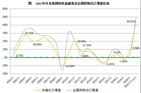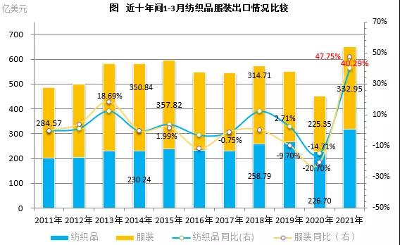 2021年1-3月,紡織服裝累計出口651億美元,增長43.8%,其中紡織品出口318.1億美元,增長40.3%,服裝出口332.9億美元,增長47.7%。