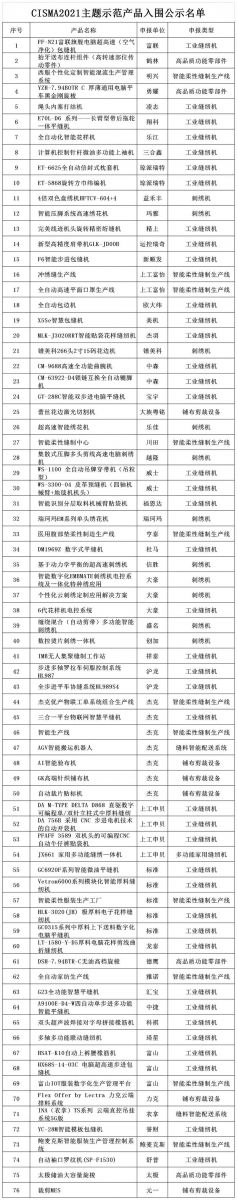 按照《CISMA2021主題示范產品評選辦法》規定,經協會科技委組織專家組嚴審優選,中國縫制機械協會理事長辦公會議審核,共有54家企業申報的76項參展展品成功入圍,入圍名單附后。