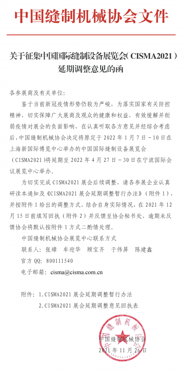 鑒于當前新冠疫情形勢仍較為嚴峻,為落實國家有關防控精神,切實保障廣大展商及觀眾的健康和權益,有效緩解并削弱疫情對展會的負面影響,在認真聽取各方意見并經綜合考慮后,主辦方決定:原定于2022年1月7日-10日在上海新國際博覽中心舉辦的中國國際縫制設備展覽會(CISMA2021)將延期至2022年4月27日-30日在寧波國際會議展覽中心舉辦。