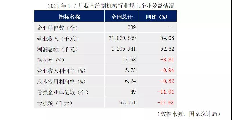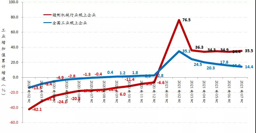 據國家統計局數據顯示,2021年前7個月我國縫制機械行業規模以上生產企業累計工業增加值增速35.5%,較上半年增長1.1個百分點,高于同期全國工業規上企業14.4%的均值,行業生產依然呈現持續復蘇態勢。7月當月行業規上企業工業增加值增速41.5%,較上月增長9.1個百分點。