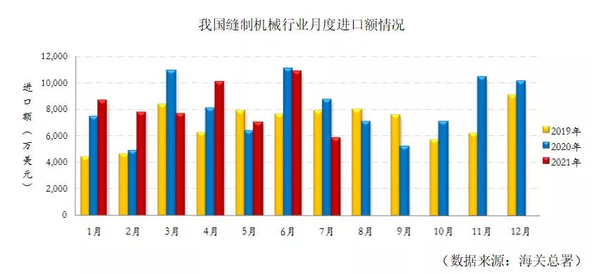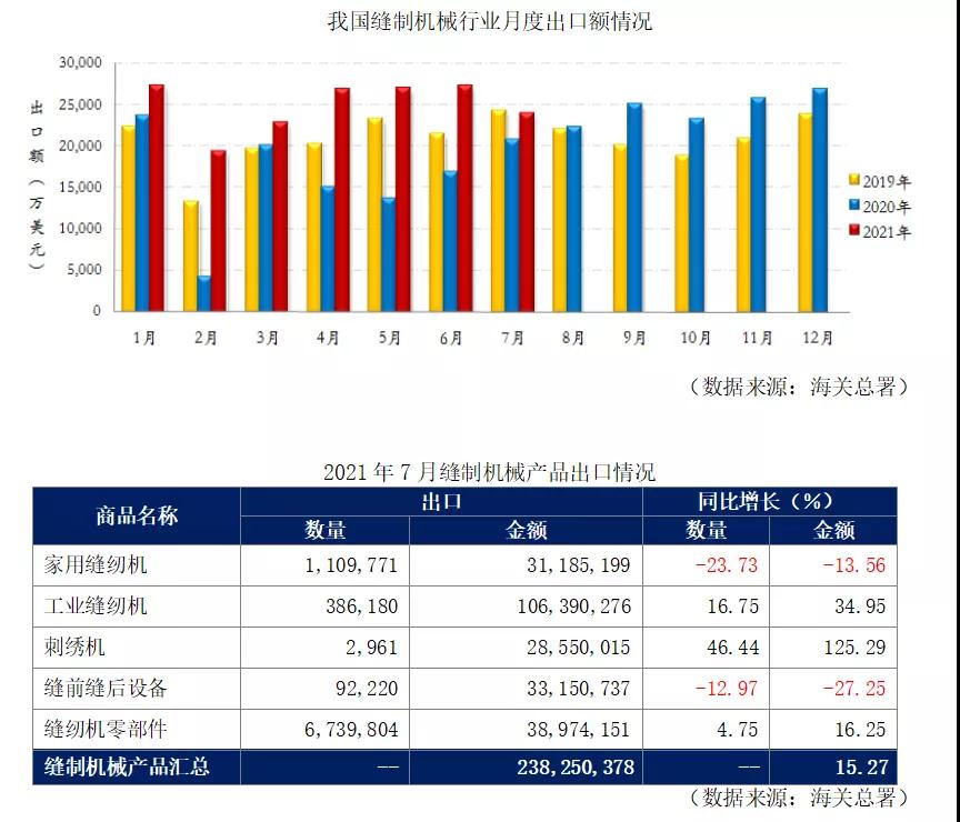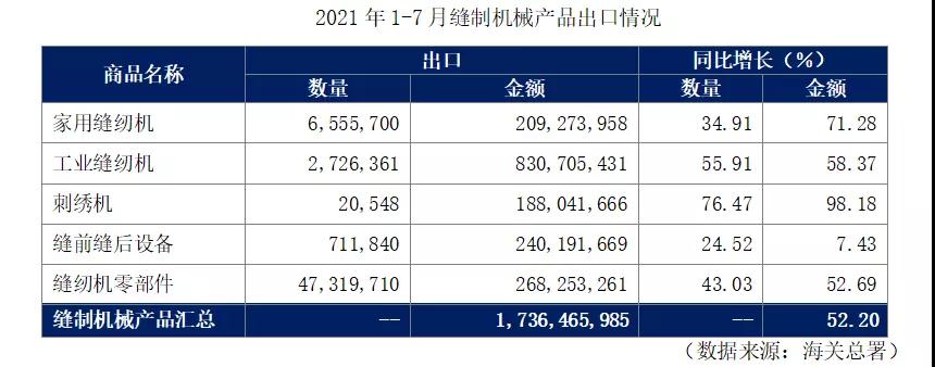 據海關總署數據顯示:1-7月我國縫制機械產品累計出口額17.36億美元,同比增長52.20%,其中,工業縫紉機出口量272.64萬臺,出口額8.31億美元,同比分別增長55.91%和58.37%。行業出口量值持續保持高位。