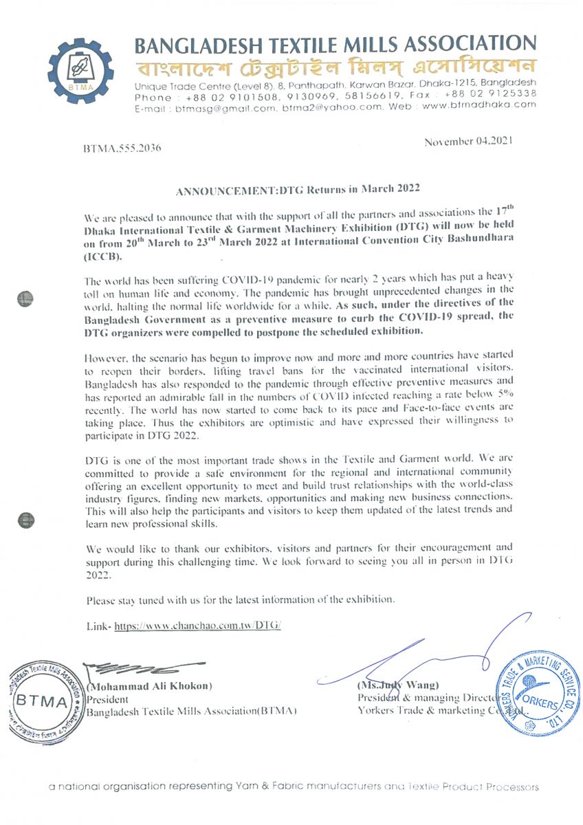原定于2022 年1 月在孟加拉首都達卡舉辦的“孟加拉國際紡織暨制衣機械展DTG”將延期至2022 年3 月20-23 日舉行,具體信息請參考下文通知: