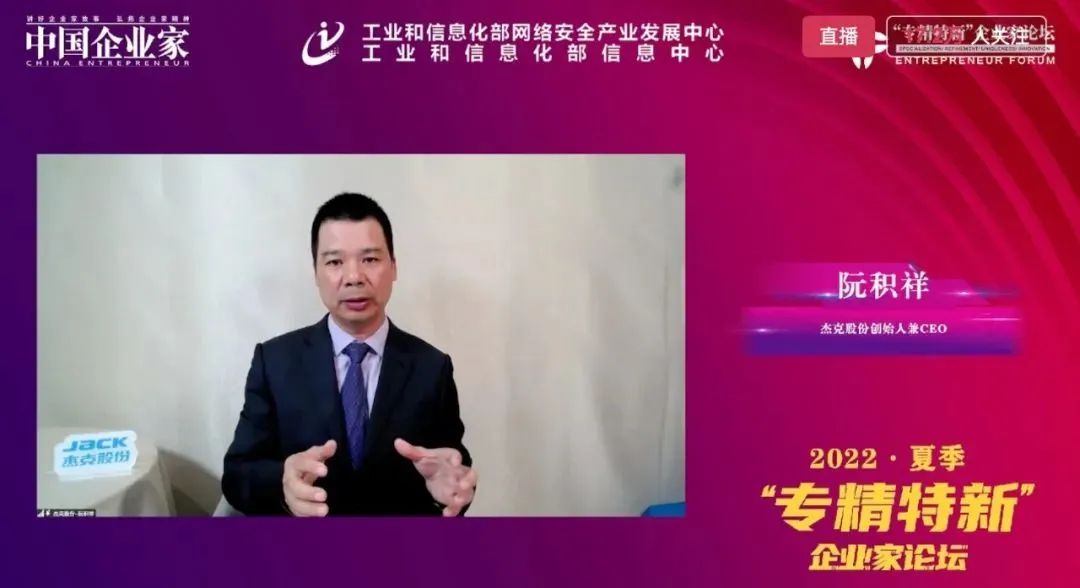 日前,由工業和信息化部網絡安全產業發展中心和《中國企業家》雜志社聯合主辦的“專精特新”企業家論壇線上啟動。杰克股份創始人阮積祥出席論壇并作經驗分享。