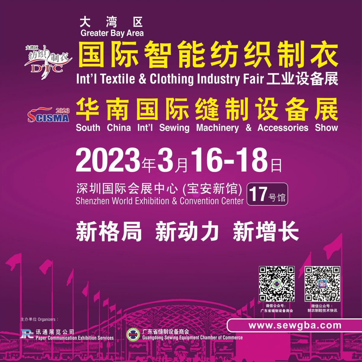由廣東省縫制設(shè)備商會(huì)、香港訊通展覽公司聯(lián)合主辦的大灣區(qū)國(guó)際智能紡織制衣工業(yè)設(shè)備展、華南國(guó)際縫制設(shè)備展、大灣區(qū)國(guó)際智能鞋機(jī)鞋材工業(yè)設(shè)備展將于2023年3月16-18日在深圳國(guó)際會(huì)展中心17號(hào)館舉行。