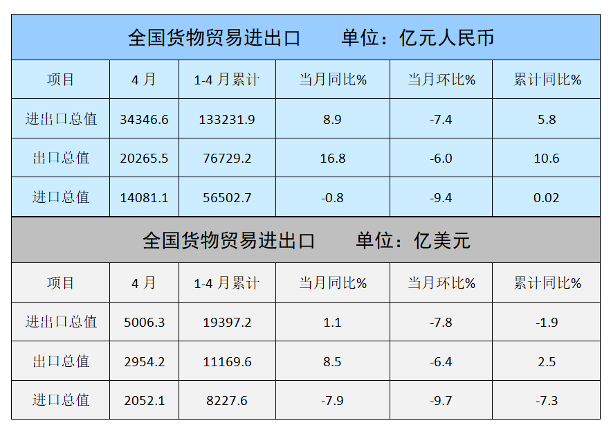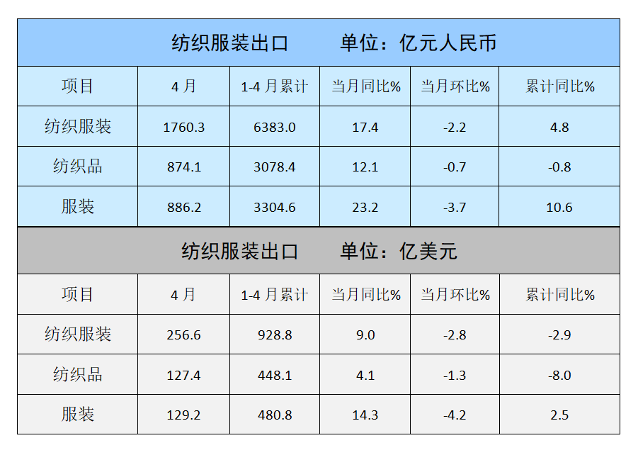 4月,紡織服裝出口256.6億美元,增長9%,環比下降2.8%,其中紡織品出口127.4億美元,增長4.1%,環比下降1.3%,服裝出口129.2億美元,增長14.3%,環比下降4.2%。