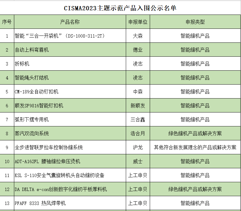 按照《CISMA2023主題示范產品評選辦法》規定,經協會科技委組織專家組嚴審優選,中國縫制機械協會理事長辦公會議審核,共有49家企業申報的68項參展展品成功入圍,入圍名單附后。