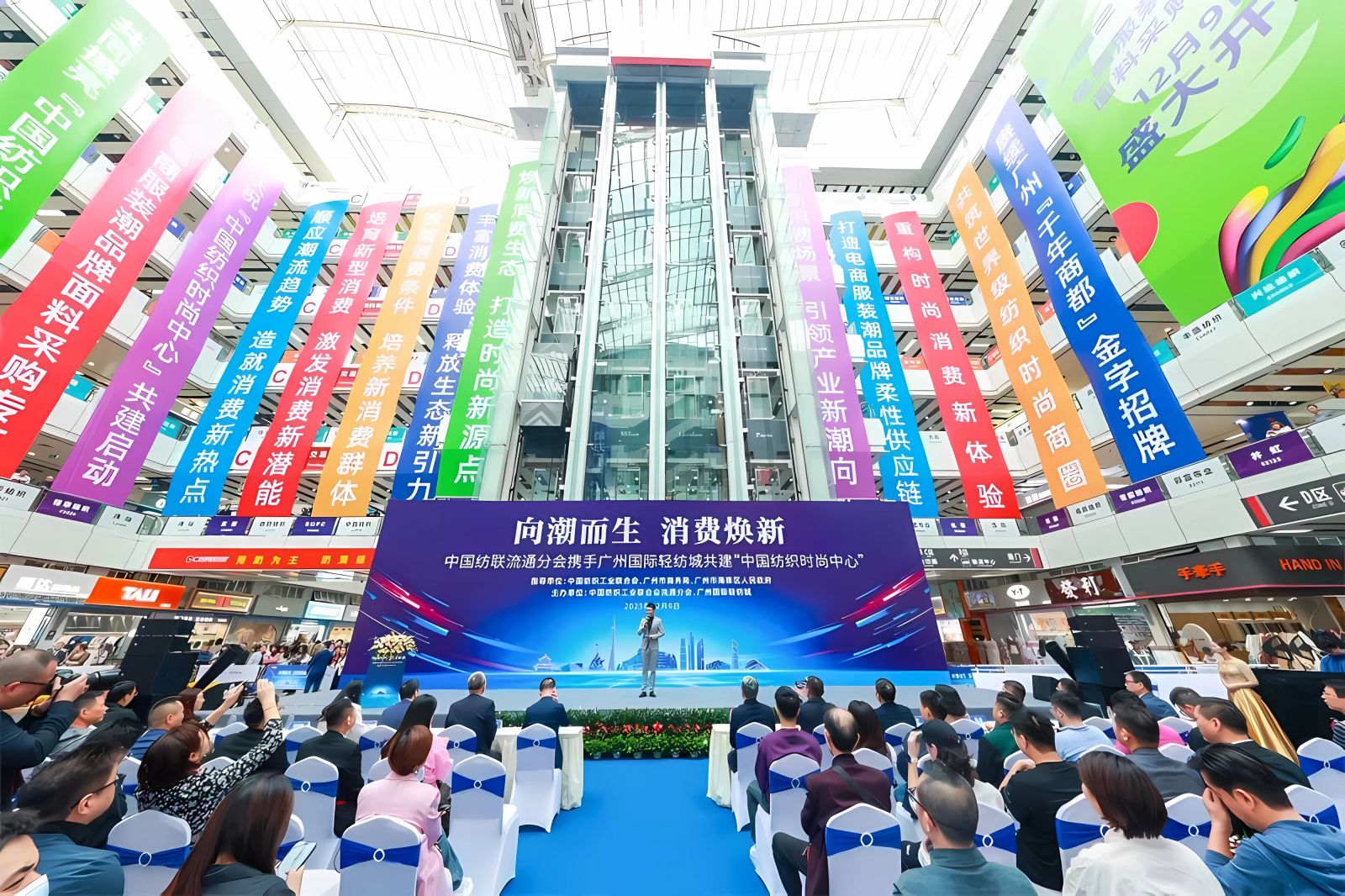 12月9日,向潮而生,消費煥新——中國紡聯流通分會攜手廣州國際輕紡城共建“中國紡織時尚中心”活動在廣州國際輕紡城1樓中庭廣場隆重舉行。活動上,中國紡織工業聯合會流通分會向廣州國際輕紡城授予“中國紡織時尚中心”牌匾,標志著全國首個紡織時尚中心正式落戶廣州市海珠區。