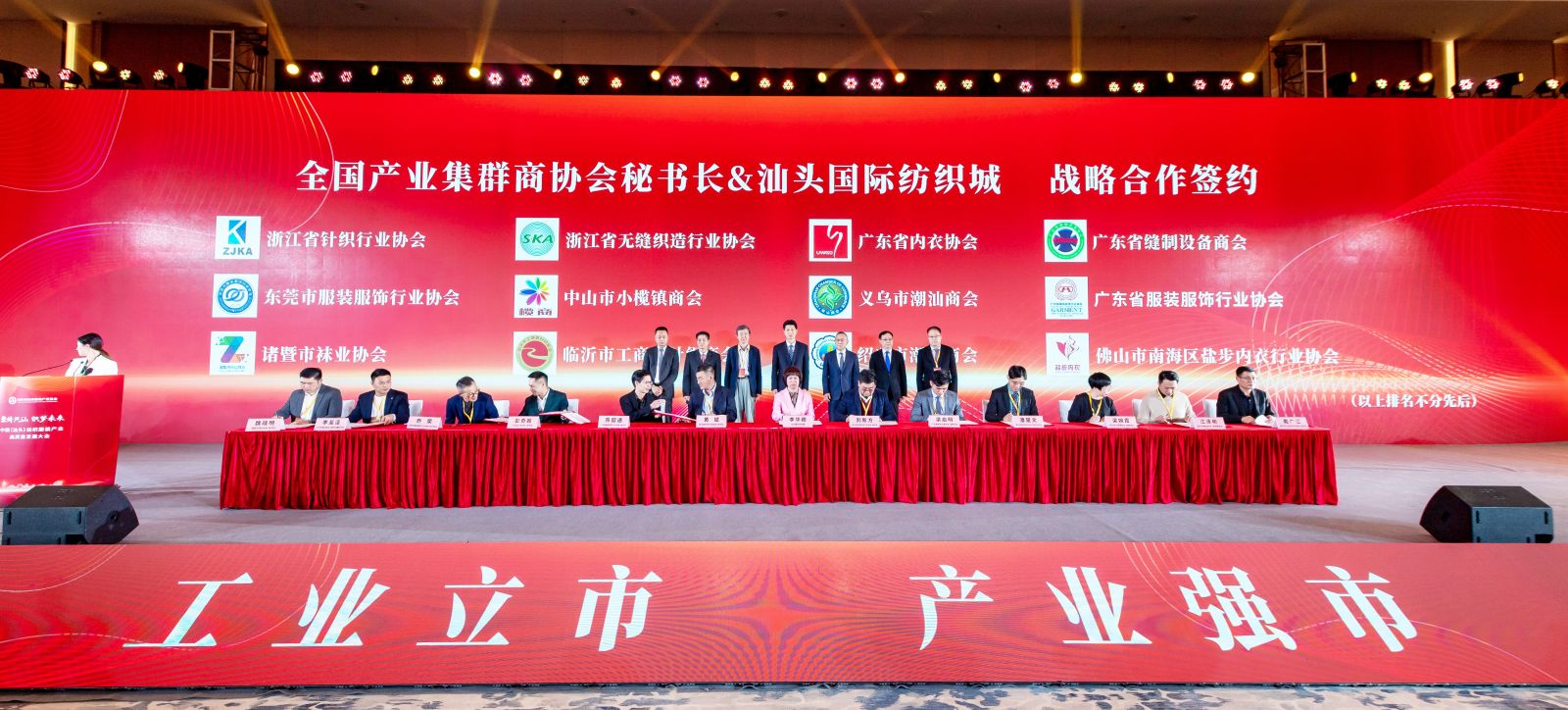 會(huì)上,汕頭國際紡織城與浙江省針織行業(yè)協(xié)會(huì)、浙江省無縫織造行業(yè)協(xié)會(huì)、廣東省服裝服飾行業(yè)協(xié)會(huì)、廣東省內(nèi)衣協(xié)會(huì)、廣東省縫制設(shè)備商會(huì)、東莞市服裝服飾行業(yè)協(xié)會(huì)、中山市小欖鎮(zhèn)商會(huì)內(nèi)衣行業(yè)聯(lián)會(huì)、義烏市潮汕商會(huì)、紹興市潮汕商會(huì)、諸暨市襪業(yè)協(xié)會(huì)、臨沂市工商聯(lián)針織商會(huì)等產(chǎn)業(yè)集群商協(xié)會(huì)代表共同簽訂戰(zhàn)略合作。與全國紡織產(chǎn)業(yè)集群探索拓寬合作領(lǐng)域,強(qiáng)化資源共享,實(shí)現(xiàn)優(yōu)勢(shì)互補(bǔ),助力汕頭紡織服裝產(chǎn)業(yè)加速發(fā)展。