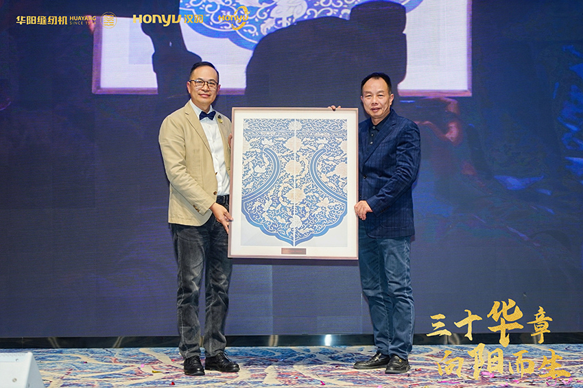 華陽公司作為商會(huì)常務(wù)副會(huì)長單位,一直以來都積極關(guān)注和大力支持商會(huì)的各項(xiàng)活動(dòng),與商會(huì)成員們攜手共進(jìn),為商會(huì)和行業(yè)的整體健康發(fā)展做出重要貢獻(xiàn)。在華陽公司成立三十周年的這一重要時(shí)刻,商會(huì)向華陽致以最真摯的祝福,祝愿華陽公司在未來的發(fā)展道路上,能夠繼續(xù)秉持優(yōu)良傳統(tǒng),不斷開拓創(chuàng)新,續(xù)寫更加輝煌的新篇章。陳耀南會(huì)長代表商會(huì)向華陽公司贈(zèng)送紀(jì)念品——《青出于藍(lán)》。這幅作品寓意著創(chuàng)新與發(fā)展,象征著超越與進(jìn)步,寄托了商會(huì)對華陽公司在未來能夠不斷突破自我、超越過往,在縫紉機(jī)行業(yè)中持續(xù)引領(lǐng)潮流、綻放更加耀眼光芒的殷切期望。