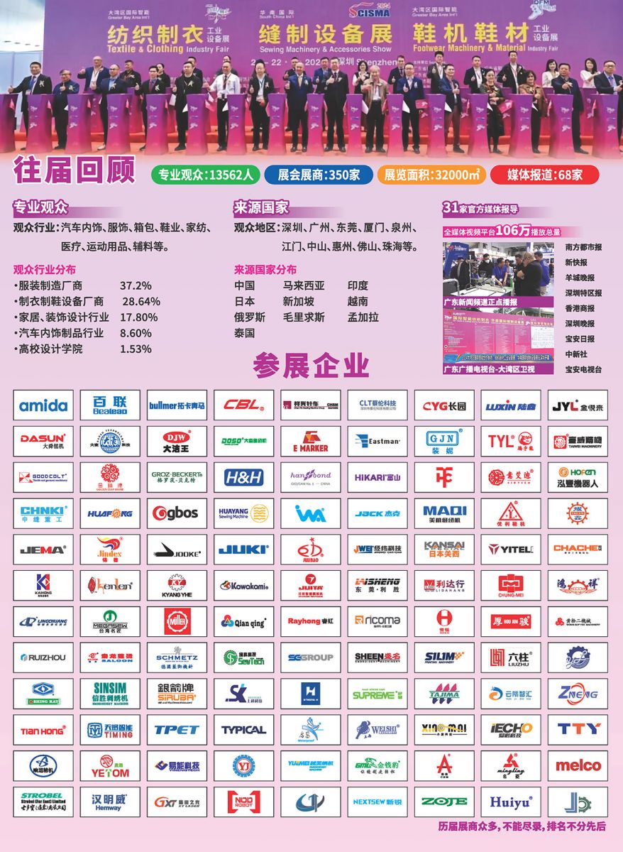 3)展會品牌與地域優勢:【大灣區制衣制鞋-華南國際縫制設備展】2000年創立,立足大灣區耕耘25年,充分輻射東莞、廣州、惠州、中山等區域市場,以及與東南亞國家市場(如孟加拉、越南等)保持著緊密的交流與合作;東莞厚街是中國重要的服裝、鞋履、箱包、家具產業基地之一,擁有完善的產業鏈和豐富的產業資源,展會展品與當地產業緊密結合,市場需求量大。