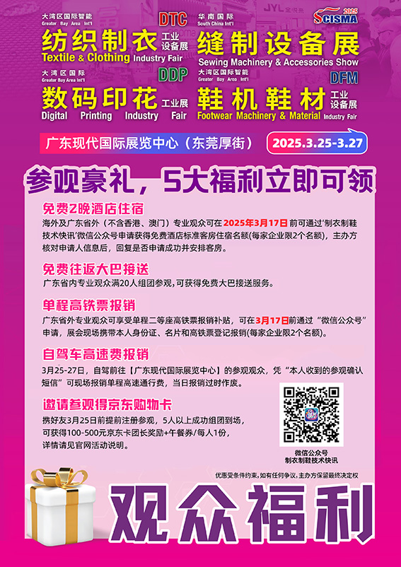 在此背景下,為了進一步加快紡織服裝行業向智能化轉型的步伐,提升整個產業鏈的技術水平與創新能力,廣東省縫制設備商會、訊通展覽公司、廣東省鞋機協會等多家單位,定于2025年3月25-27日在東莞厚街廣東現代國際展覽中心舉辦2025大灣區國際智能紡織制衣工業設備展、華南國際縫制設備展、國際智能鞋機鞋材工業設備展,展覽面積50000平米,500+行業企業參與。
