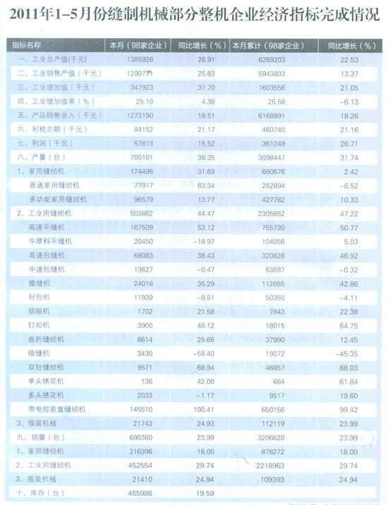 > 2011年1-5月縫制機械部分整機企業經濟指標完成情況