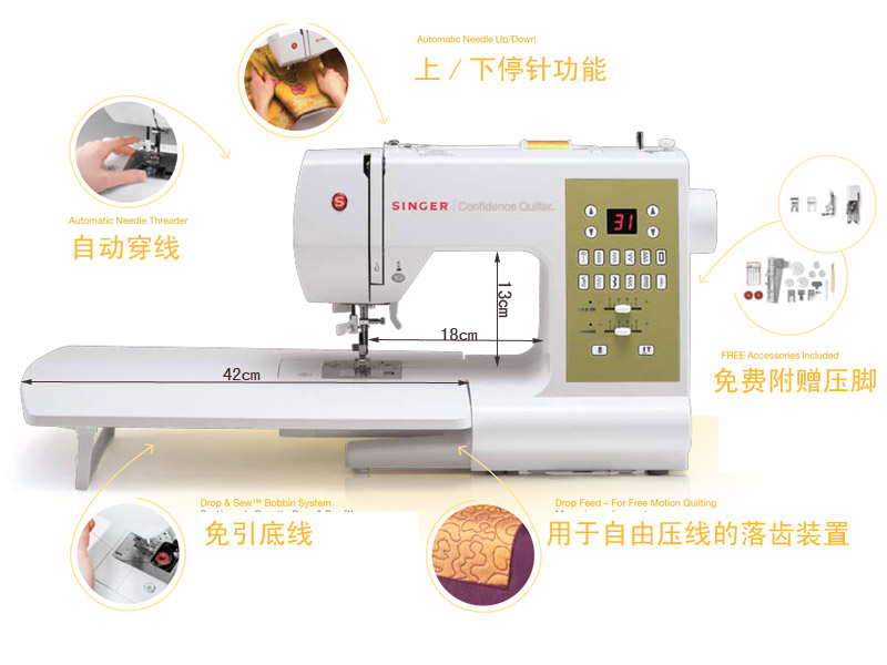 ● 快速穿線器。 ● 免引底線系統。 ● 按鈕式選擇線跡。 ● LED兩燈照明。 ● 自動線張力調節器。 ● 落牙裝置。 ● 上/下停針。 ● 雙針縫紉。