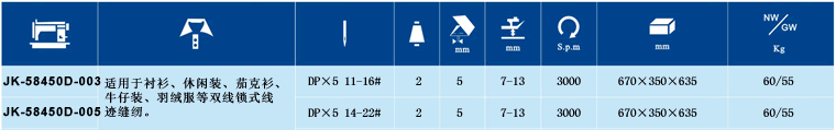 JK-58450D是一款雙針平縫機,該產品主要是適用于襯衫、休閑裝、茄克襯、牛仔裝、羽絨服等雙線鎖式線跡縫紉。