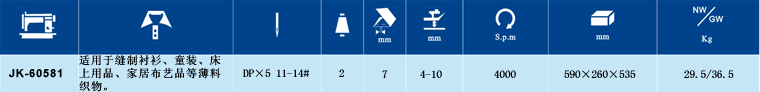 本機型是杰克平縫機系列中的新品。采用連桿式針送料機構,針送料方式使送料更加穩定,縫料層之間不易產生滑移。裝置了可調式切布機構。調節操作方便,設計精巧,省時省力、縫制與切除縫料邊一次完成。本機外形新穎大方,維護調節簡單,噪音低、震動小,適用與縫制襯衫、童裝、床上用品、家居布藝品等薄料織物。 JK-60581采用了數字電路控制、配置專用電子電動機、具有自動剪線等數種功能、操作效率極高
