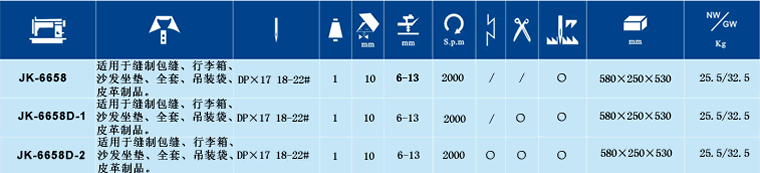 JK-6658BD是在JK-6658機型的基礎改進電腦機,專門設計為厚重物料所用。結構堅實,強力送布系統,高壓腳行程,高壓腳提升間隙和大的線跡長度,能輕易應付難處理和大塊的面料和粗線。行走安全順暢,壓腳踏步產出卓越的縫紉功能。采用下送布、針送布和可調校交替壓腳上送布的綜合送布方式。適用于縫制包袋、行李箱、沙發坐墊、拳套、吊裝袋、皮革制品。JK-6658-D1采用電子調速電機及微電腦控制自動剪線機構,具有自動剪線功能。JK-6658-D2采用專用電子調速電機,微電腦控制自動剪線和自動定針位、自動加固縫。