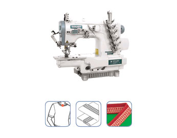 適用于內(nèi)衣褲、T恤之領(lǐng)口、褲管口等上帶滾邊之車縫工程。加裝電動控帶裝置與后拉引滾輪,可增加車縫質(zhì)量。