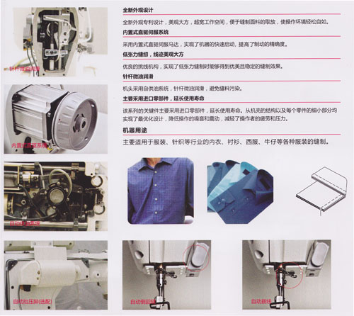 耗省電、經濟實惠;機頭臂下空間寬敞、縫料回轉操作方便。