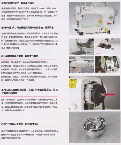 采用內置式直驅伺服馬達、實現了業內最高水準的節能效果。 采用最新的機頭無油化技術、大幅度地延長了潤滑脂的耐用時間。 反應敏捷、縫紉舒適;沒有油污的清潔縫紉;簡單易懂、使用方 便的操作控制盤;噪音低、振動小,縫紉操作舒適;保養方便; 耗省電、經濟實惠;機頭臂下空間寬敞、縫料回轉操作方便。