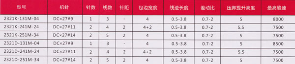 2321K-241M-24系列超高速包縫機是勝家最新開發的全新包縫系 列,擁有多項國家專利;通過優化設計提高轉速(最高轉速8500rpm)、 延長使用壽命、使操作更加方便、舒適;廣泛適用于各種針織面料、 平布、牛仔服裝及床上用品等的搭接鏈、裝飾縫;包邊寬度范圍廣, 最小包邊寬度1.5mm,最大包邊寬度8mm;同一臺機器能適應多種 布料、多種線跡的縫紉,具有卓越的性價比。