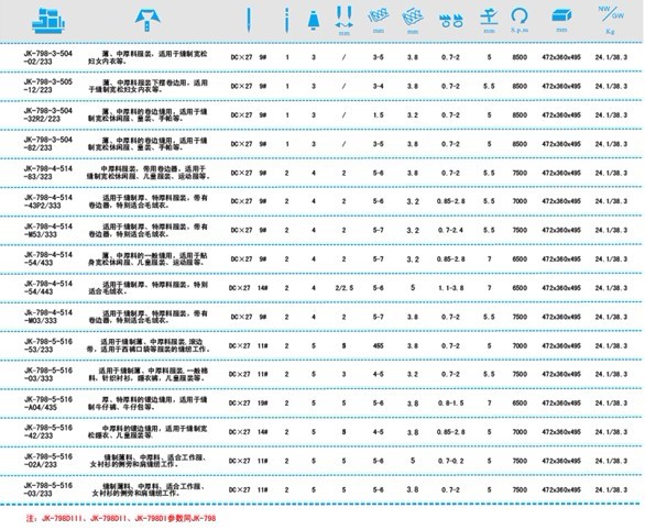 JK-798超高速包縫機系列廣泛適用于服裝、內衣、床上用品及薄形包裝和皮革制品等各種面料的搭接縫、裝飾縫,另外還有多種線跡可供選擇。其通過簡單的張力調節便可縫出完美的線跡。送料機構的改良,而零件的耐磨設計延長了機器的使用時間。同時,對差動比、針桿行程量的調節方式的改進大大提高了操作的便捷性。