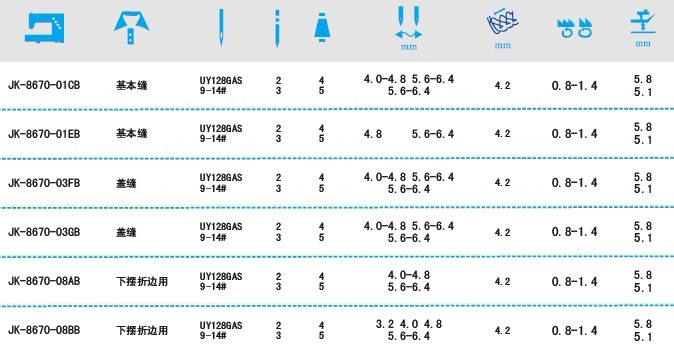 JK-8670小筒式繃縫機系列基本適合縫紉任何服飾,特別適用于女性T恤領頭蓋縫,嬰兒服,卷袖等縫制作業。小頭周長僅180mm。