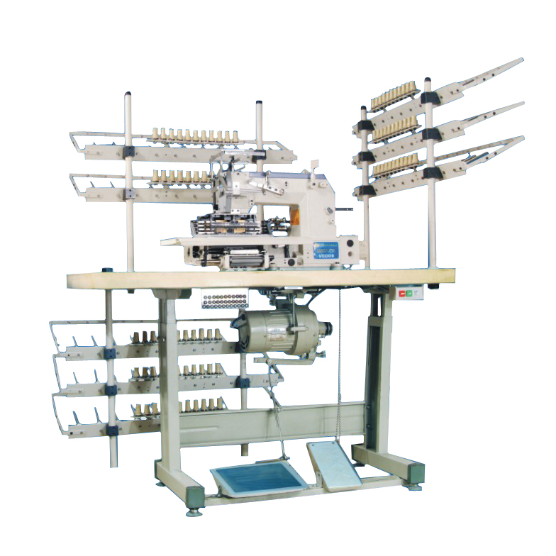 此機上線采用普通線,下線采用松緊線。運用多款式樣的凸輪花盤,再與裝飾互相搭配,創造出種類繁多且吸引人的花樣圖案。適用于女裙打褶,連衣裙等腰邊松緊打褶,對于各種童裝、床上用品的裝飾縫,亦可選擇配置不同的花盤,縫出想要的圖案。