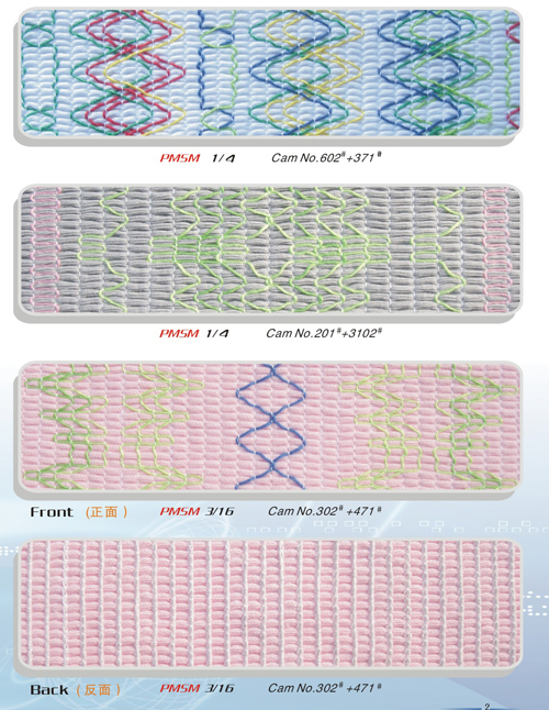 Using polyester as needle thread and elastic thread as looper thread Utilizing varied modal cams,andcombining these cams with ornamental thread,could create the varied smocking patterns.Suitable for simultaneous shirring of waist skirt-ruffling omepiece dress,also suitable for children’s wear and bed-used,stitching sewing pattern can be chosen different cams.