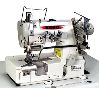 • 本機具有機械式送帶裝置,可將松緊帶或蕾絲帶的送料量及張力控制得均勻而準確,同時具有切刀修邊器裝置,提高縫制質量。適用于內衣、內褲等。