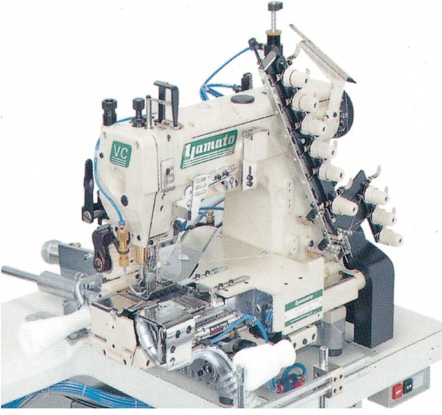 日本制多針筒狀鏈式機 超高速、圓柱機臺、多針縫紉機帶拉伸器 該機型是雙鏈4排針節式多針縫紉機。 用包縫機將環狀連結式平織松緊帶縫制完腰帶內側后,使用此機反向縫制 第二道工序。 最適用于運動褲、嬰兒和兒童服的收斂部分所安置的松緊帶。 折疊器滑板的性能將提高生產效率。