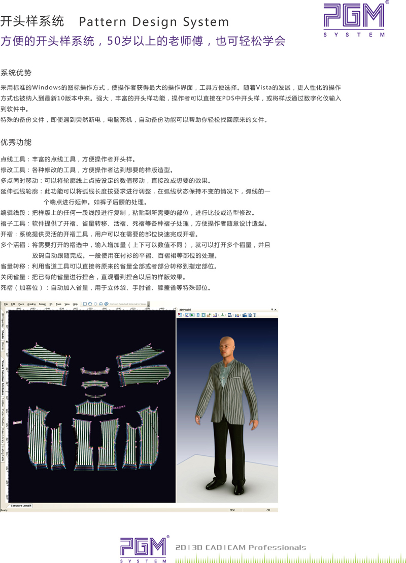 PGM樣版設計軟件能夠簡單快捷的輸入現在已有的紙樣。最復雜樣版的所有細節都可以毫無遺漏的保存。只需要很少的幾個點就可以保證同原始樣版曲線的吻合。任何樣版都可以在幾秒鐘之內完成描圖。