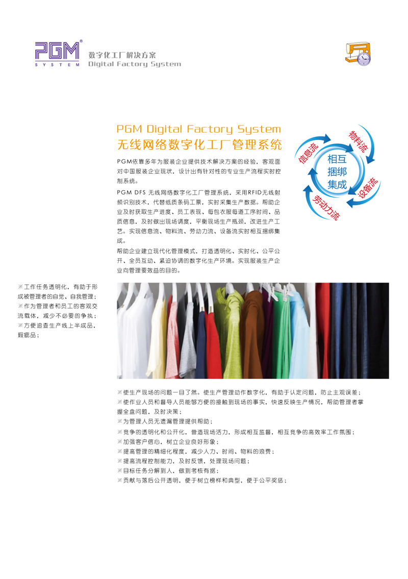 PGM DFS 無線網絡數字化工廠管理系統,采用RFID無線射頻識別技術,代替紙質條碼工票,實時采集生產數據。幫助企業及時獲取生產進度、員工表現、每包衣服每道工序時間、品質信息,及時做出現場調度,平衡現場生產瓶頸,改進生產工藝。實現信息流、物料流、勞動力流、設備流實時捆綁集成。